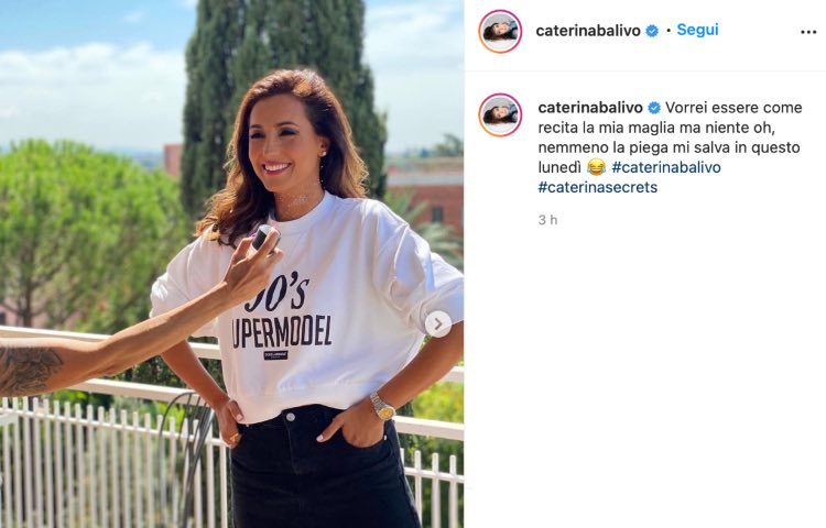 Caterina ha sfoggiato una maglia bianca oversize, in stile anni ’90, così come recita la scritta. “90’s Supermodel”, e il riferimento in didascalia è fin troppo scontato. “Vorrei essere come recita la maglia”, ha scritto la Balivo.