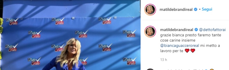 Matilde annuncia una nuova collaborazione anzi, fa una promessa importante proprio a lei: Bianca Guaccero. La ballerina infatti sarà un nuovo volto di Detto Fatto, iniziato ufficialmente proprio nella giornata di ieri. “Mi metto a lavoro per te” ha scritto Matilde che promette tante cose carine per il pubblico e Bianca.