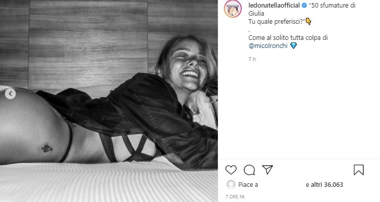 Nelle foto indossa un completino intimo pazzesco che a stento la copre, sotto è sgambatissimo e sopra il reggiseno è fatto di ‘nastri’ che lasciano poco all’immaginazione, si vede quasi tutto. Nella didascalia ha scritto ’50 sfumature di Giulia’, ha poi chiesto ai suoi seguaci di dirle quale preferiscono.