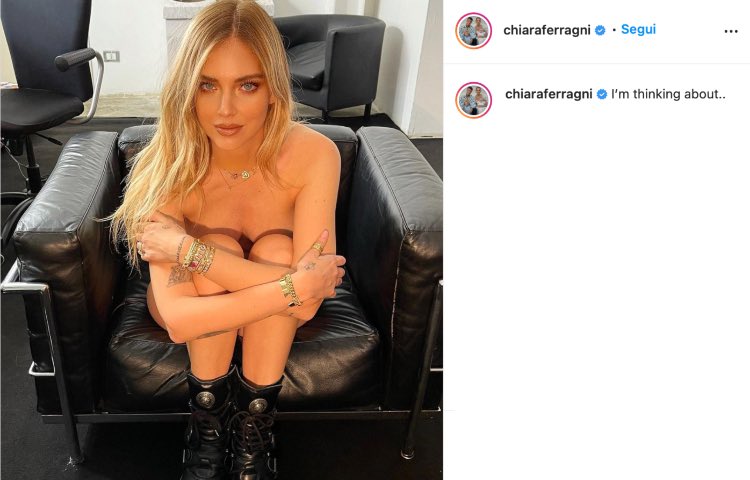 Si sono sprecati con le più controverse ipotesi i fan nei commenti. E’ stata la stessa Chiara a chiedere alla sua community di provare a indovinare a cosa stesse pensando in quel momento. Probabilmente un metodo per creare “hype”, magari collegato a qualche collaborazione o nuovo capo da pubblicizzare. O semplicemente un modo per creare quante più interazioni possibili nel post.