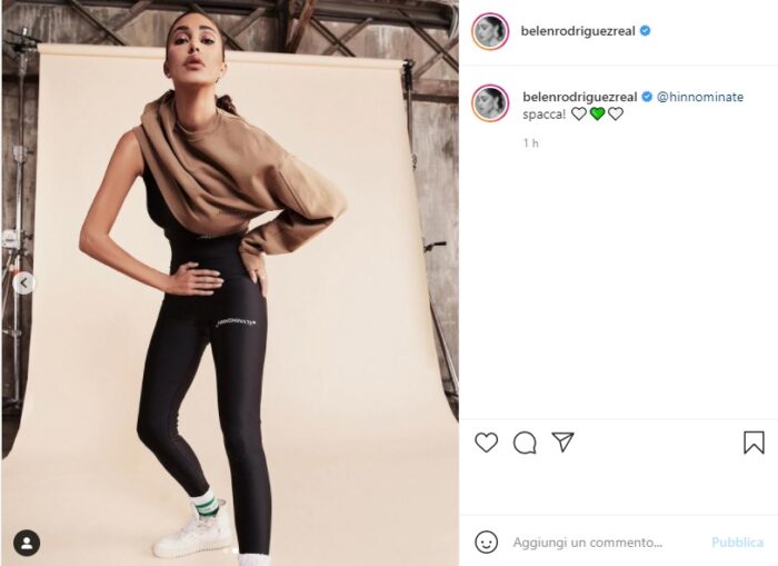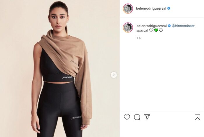 Eccola qui, dunque, la bellissima Belen mentre posa in tutta la sua serietà con la nuova tenuta da allenamento che sta sponsorizzando. Porta dei leggings a vita alta, un top, entrambi neri e attillatissimi, e sopra una maglia a maniche lunghe che sta per togliere, ovviamente.