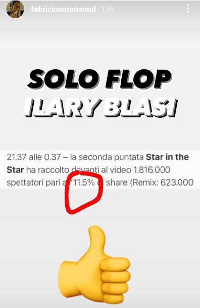 Il nuovo programma condotto da Ilary non ha ottenuto il successo sperato. Per questo Corona è tornato all’attacco pubblicando i dati di ascolto, molto bassi, registrati nella seconda puntata di Star in the Star. Come potete vedere, ha poi scritto: