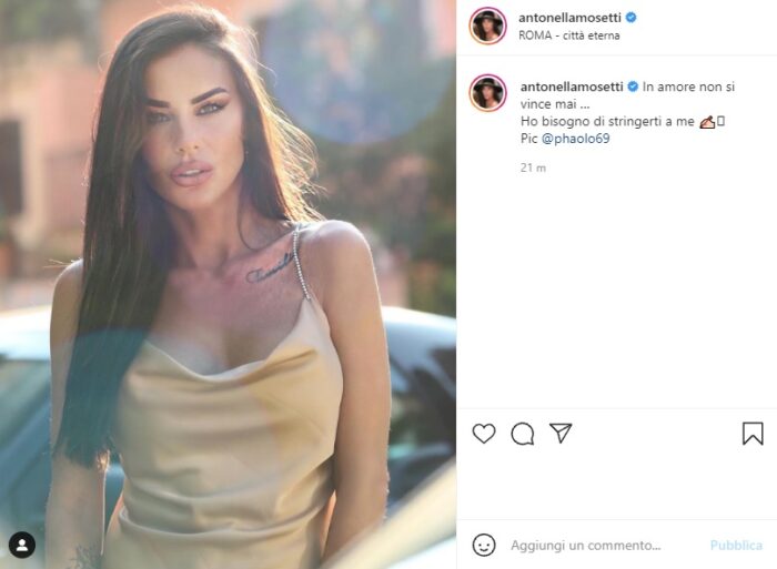 Eccola qui, dunque, in tutta la sua bellezza. Come potete vedere dallo screenshot del suo post riportato nell’articolo, l’ex gieffina indossa un vestito d’oro che comunque non nasconde per nulla le sue forme strepitose. Lei gioca tutto sulla sua sensualità: capelli lunghi tutti da un lato, sguardo penetrante e bocca socchiusa.