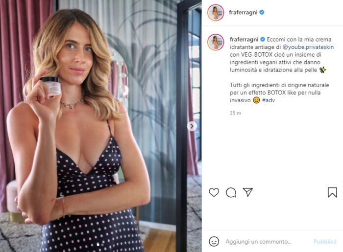 Come potete vedere dallo screenshot del suo post, poi riportato qui nell’articolo, Francesca ha presentato la sua crema idratante antiage con molto orgoglio. Ci ha tenuto a specificare che tutti gli ingredienti sono di origine naturale per regalare l’effetto botox sulla pelle per nulla invasivo.