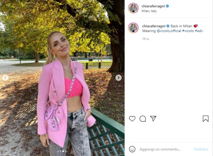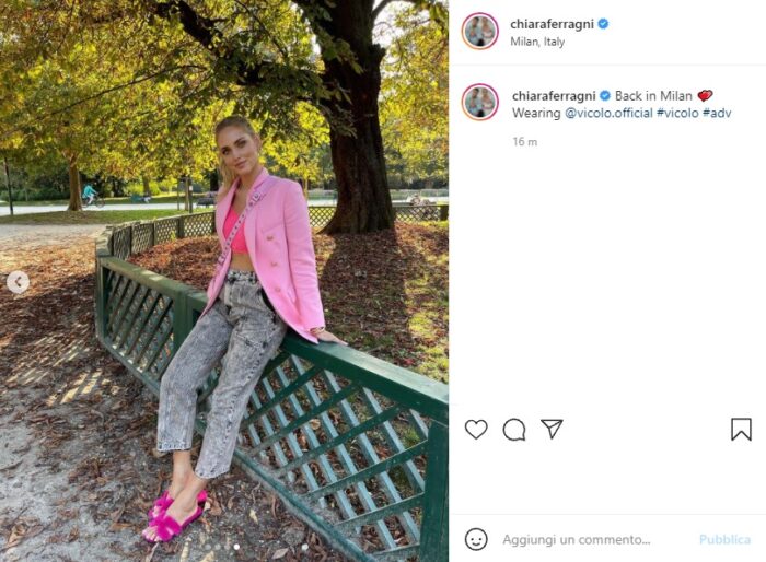 In un’altra foto a figura intera, Chiara ha anche mostrato la lunghezza dei suoi jeans e le scarpe che ha deciso di indossare per l’occasione. Naturalmente sono rosa. I suoi follower erano curiosi, infatti, di sapere come era vestita in ogni dettaglio per poter prendere spunto. In pochissimo tempo decine di migliaia di like e commenti tutti per lei.