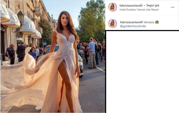 Nell’ultimo post pubblicato, in quel di Venezia, indossa un abito da sera mostrato già alla mostra del cinema; lo spacco è di fatto inguinale e si vedono le sue gambe perfette. Ha i capelli sciolti oltre le spalle e lo sguardo sensuale, ma può sembrare quasi pronta al grande passo, essendo un abito facilmente individuabile in nuziale.
