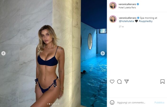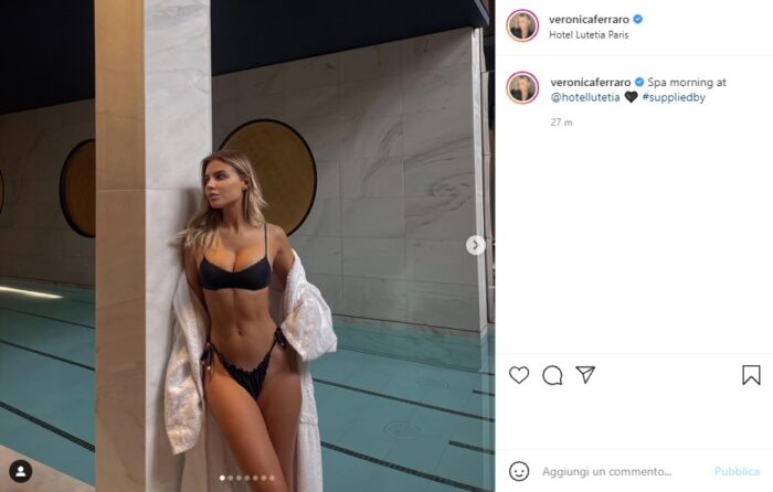 Eccola qui, dunque, la bellissima Veronica mentre si prende una pausa dagli impegni e si concede una mattinata nella spa dell’albergo dove alloggia in questi giorni. Come potete vedere benissimo anche voi, l’influencer ha posato in costume, a bordo vasca, con un costume scuro ma decisamente striminzito.