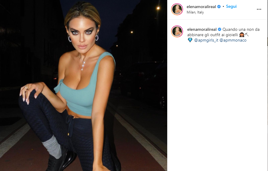 Elena indossa un top scollato di color azzurro che a stento contiene le sue curve. In posa piegata su stessa e con lo sguardo dritto verso i fan, la Morali abbassa la spallina del top ed in un attimo stende tutti i follower.