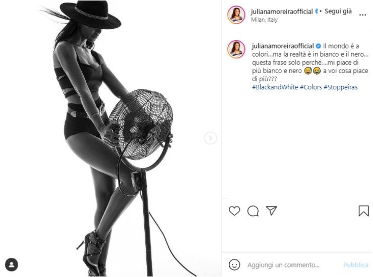 Anche questa mattina infatti arriva una foto che lascia senza fiato i suoi followers. Tacchi vertiginosi, shorts che mostrano la sensualità delle sue gambe, un top con fasce che si intrecciano ed evidenziano il ‘davanzale’, un cappello da cowgirl e un ventilatore che punta proprio lì e che viene abbracciato in maniera bollente. Nella descrizione la modella brasiliana svela che l’effetto in bianco e nero è il suo preferito, e dagli ultimi post si era capito. Infine chiede ai suoi fan se preferiscono le foto a colori o in bianco e nero, ma probabilmente si accontenteranno di vederla in ogni modo.