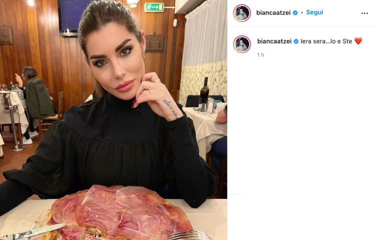 Tantissimo spazio come sempre per il compagno sui social, anche se questa volta la dedica è arrivata in didascalia. Scatto in solitaria pubblicato questa mattina da Bianca Atzei, la quale ha condiviso con i fan solo oggi il momento romantico della serata di ieri. La cantante si è immortalata al tavolo, con tanto di golosissima pizza sotto al naso, in un completo nero elegantissimo.