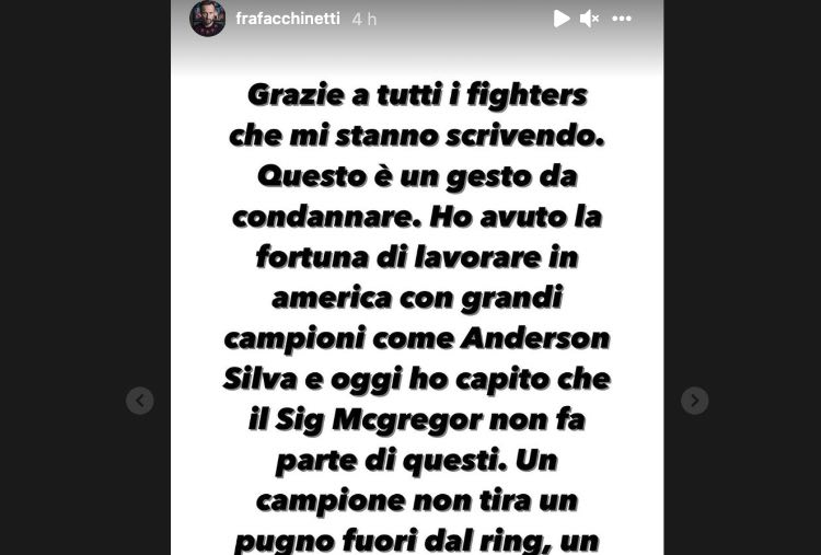 “E’ un pericolo, non è fatto per stare in una società civile”, continua Francesco, che ha registrato il video ieri notte pubblicandolo solo nella mattinata di oggi. Da quanto scritto successivamente da Facchinetti, probabilmente McGregor deve aver dato segni di squilibrio: “Poteva tirarlo a mia moglie, o ai miei amici”. Le storie sono ancora disponibili sul suo profilo Instagram ufficiale.