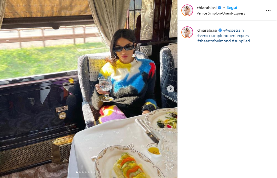Anche lei sta viaggiando all’interno del treno di lusso e, nel cuore della notte, ha condiviso con i follower i suoi scatti. Il cibo, la location, il panorama ed un suo immancabile ritratto. Chiara indossa un cardigan multicolor, capelli legati e occhiali da sole, un look che la rende quasi irriconoscibile. Ma i fan la riconoscerebbero tra tante e per i più è sempre una “Dea incantevole” come si legge tra i commenti.