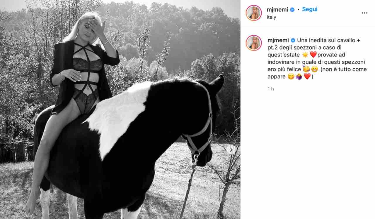 In didascalia è intervenuta: “Una inedita sul cavallo + pt.2 degli spezzoni a caso di quest’estate”. Poi si rivolge ai fan, sfidandoli: “Provate ad indovinare in quale di questi spezzoni ero più felice (non è tutto come appare)”.