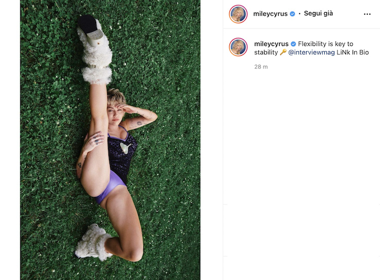 Con un post su Instagram, Miley Cyrus decide di ricordare ai suoi tantissimi fan l’uscita della sua intervista. La giovane star usa una foto chiaramente ripresa dallo shooting in cui mostra una discreta elasticità e, con le gambe in una spaccata al contrario, manda questo reminder ai follower.