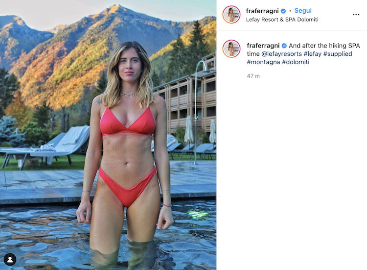 Oggi, per esempio, Francesca ha condiviso un suo scatto che la vede lì, sulle Dolomiti, in una splendida Spa immersa nella natura. La dottoressa Ferragni, con il suo bikini rosso, esce dalle acqua della piscina dopo un trekking e una passeggiata ad alta quota. Splendida e con un corpo mozzafiato, è a suo agio e nel suo elemento.
