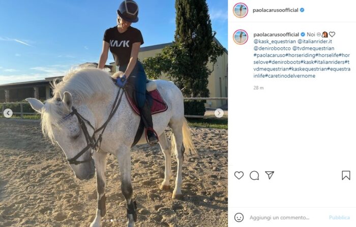 Come potete vedere anche dal post riportato qui nell’articolo, Paola oggi è in una versione sportiva e si è dedicata all’equitazione: stivaletti, jeans stretti, maglietta a maniche corte e casco per ogni eventualità. Con lei il bellissimo animale che l’accompagna nei suoi movimenti e nella sua passeggiata.