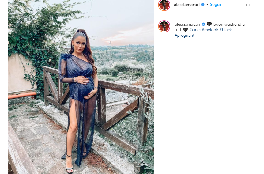 Con indosso un abito lungo nero e trasparente, l’influencer si lascia immortalare con un paesaggio autunnale alle spalle. Alessia tiene tra le braccia il suo tenero pancino ma avanza con la gamba destra lasciando che lo spacco vertiginoso si apra e la renda davvero sensuale. Tacchi a spillo e capelli legati, la Macari mostra come nonostante il pancione non bisogna mai perdere la propria femminilità.