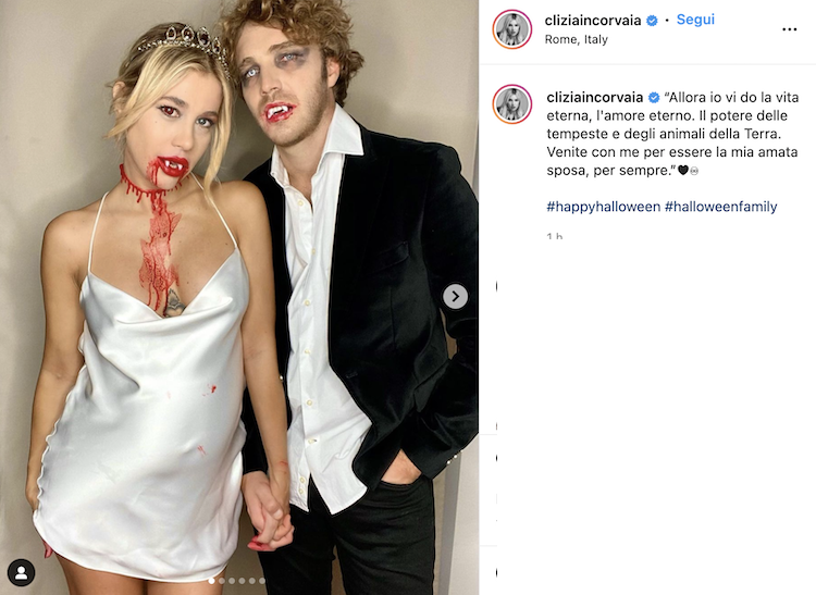 Eccoli, quindi, insanguinati e pallidi in volto, sfoggiare un look davvero pauroso. Sono soprattutto i dettagli del costume di Clizia a farsi notare: il sangue finto che scende dalla bocca, il taglio sul collo e gli occhi di colore diverso sono tutti tocchi di classe che solo dei veri fan dell’horror potevano pensare.