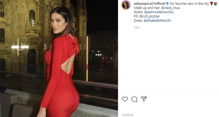 Nello scatto l’incantevole modella venezuelana mostra ai fan la sua vista preferita di Milano, si trova davanti al Duomo sulla terrazza della Rinascente. Il panorama è stupendo ma lei lo è di più, i fan infatti guardano lei. La Yespica è girata quasi di spalle e indossa un attillatissimo vestito rosso che le lascia un po’ la schiena scoperta.