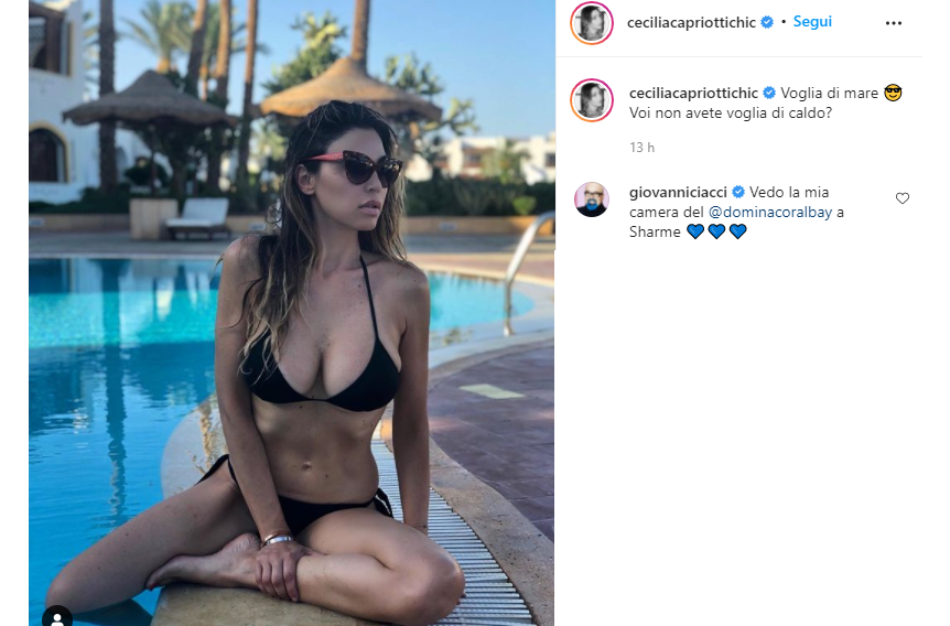 Cecilia siede a bordo piscina con indosso un bikini nero che lascia in mostra il suo fisico da urlo. Occhiali da sole e viso rivolto verso l’orizzonte, l’attrice è meravigliosa. Lei non scrive dove si trova ma qualcuno lo fa al suo posto. “Vedo la mia camera a Sharm El Sheikh” ha scritto Giovanni Ciacci che vorrebbe essere proprio lì.