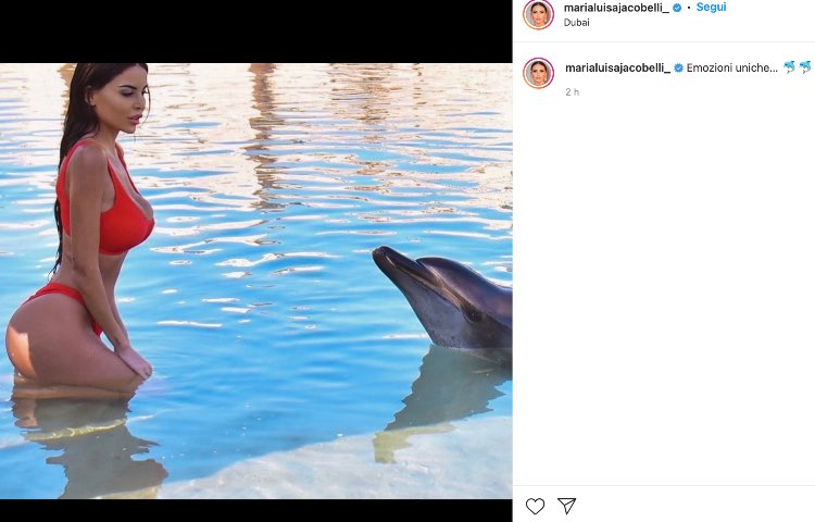 Tra escursioni in moto d’acqua, cene di lusso, resort incantevoli, questa mattina è arrivato un bellissimo scatto in piscina, in dolce compagnia. Seduta in acqua Marialuisa è davanti a un delfino, e i due quasi si fissano intensamente. Meraviglioso ed esplosivo il bikini rosso.