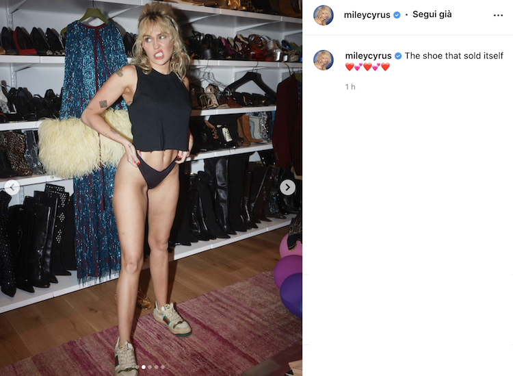 Eccola, splendida e cool, mentre si prepara per il party di Gucci. Nella foto, Miley indossa l’intimo, un top e delle scarpe del brand. Ogni dettaglio serve per mettere in evidenza le sue gambe, toniche e bellissime. I commenti dei follower, famosi e non, si sprecano. Un altro colpo azzeccato.