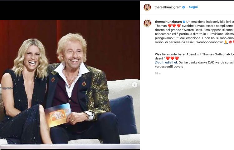 “Avrebbe dovuto essere semplicemente il ritorno del grande “Wetten Dass”, ha commentato la Hunziker nel suo ultimo post. La donna si è mostrata infatti in una serie di foto in compagnia di Thomas Gottschalk, conduttore storico della trasmissione tedesca, direttamente dagli studi dello show. Ben 5 scatti, con gli attimi salienti della serata, insieme a tanti contenuti anche nelle storie per Michelle.
