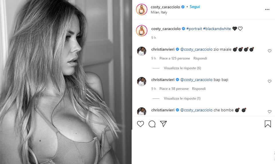 Scatena i fan di Instagram Costanza Caracciolo con la sua foto in bianco e nero. Tra i commenti, quelli di Bobo Vieri non passano inosservati.