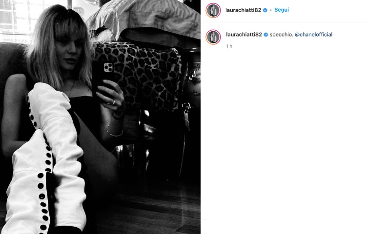 L’attrice si è infatti immortalata allo specchio, in un selfie con filtro bianco e nero, saturazione massima e luminosità molto ridotta. Unica luce nello scatto i suoi stivaloni bianchi, messi in primo piano, mentre Laura si siede per terra sul parquet.