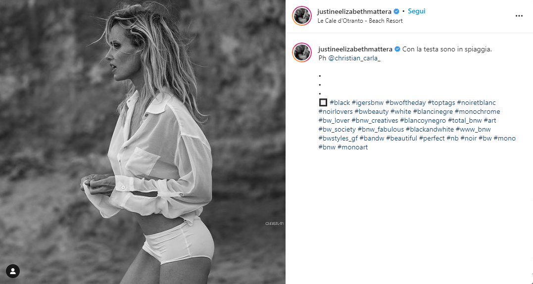 Sguardo rivolto verso l’infinito e capelli mossi dal vento: Justine incanta i fan con una foto in bianco e nero. Con indosso soltanto un paio di slip bianchi ed una camicia dello stesso colore, la showgirl sprizza sensualità da tutti i pori. “Con la testa sono sulla spiaggia” ha scritto la bionda americana che vorrebbe tornare indietro nel tempo come, di certo, anche i suoi fan.
