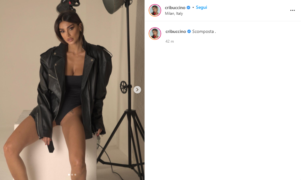 Impegnata in uno shooting fotografico per lavoro, la meravigliosa Cristina scatena i commenti ed i like dei fan. Seduta su uno sgabello con indosso una giacca di pelle nera, l’influencer incanta con la sua sensualità. Un body nero spunta dal chiodo ed enfatizza le sue splendide forme.