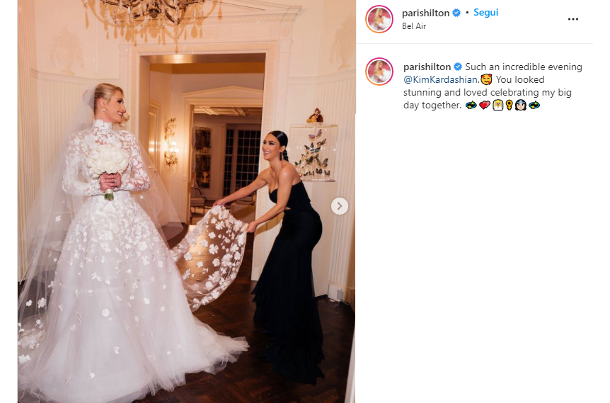 Sorridenti e felici insieme, l’ereditiera ringrazia Kim per esserle stata al suo fianco nel giorno più importante. La mora indossa un abito lungo scollato, mettendo ben in mostra le sue curve. Intenta a sistemare il velo della sposa, Kim le sorride e mostra tutta la sua gioia. Il suo abito non è passato inosservato non solo per il colore ma anche per la scollatura disarmante che ha colpito il mondo intero.
