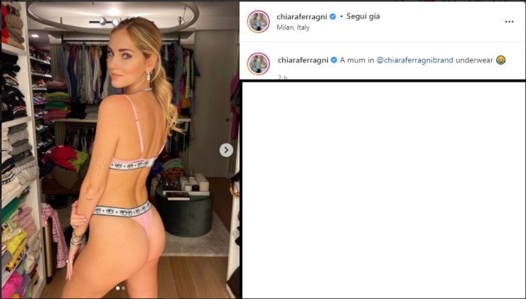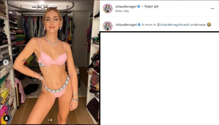 Ed in intimo si è mostrata anche nell’ultimo post. Nel suo solito angolino casalingo, in quella che sembra la stanza armadio, la Ferragni si è messa in posa in tutta la sua bellezza. Stavolta, però, lo slip ed il reggiseno sono “di casa”, del suo marchio. “Una mamma con l’intimo di Chiara Ferragni brand” ha scritto nella didascalia del post.