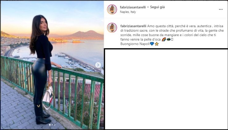 Nell’ultimo post la Santarelli ha omaggiato la città di Napoli con un vero e proprio messaggio d’amore. “Amo questa città” ha scritto, “perché è vera, intrisa di tradizioni sacre ed autentica” per poi proseguire “le strade profumano di vita, sorride la gente, i colori dei cielo ti vanno venire la pelle d’oca e mille cose buone da mangiare“.