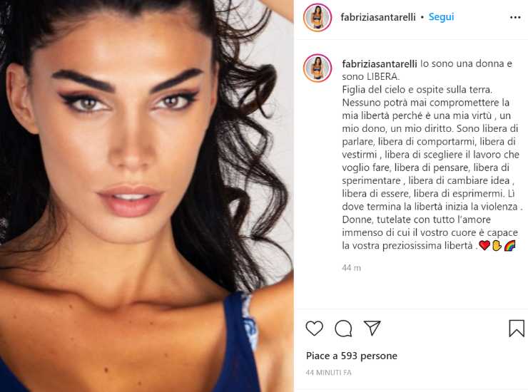 La libertà, come sottolinea la influencer e presentatrice, è un diritto che deve sempre essere tutelato affinché si possa mettere fine alle violenze contro le donne, ancora oggi purtroppo una piaga difficile da estirpare. “Donne, tutelate con tutto l’amore immenso di cui il vostro cuore è capace la vostra preziosissima libertà” ha concluso Fabrizia.