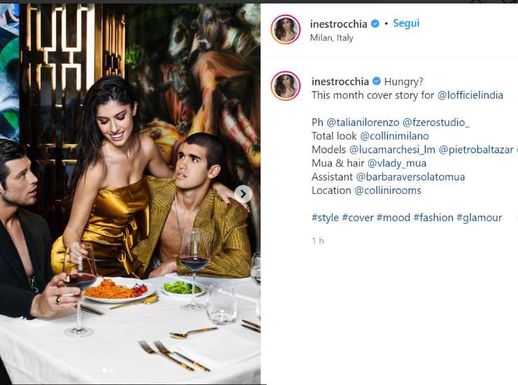 La modella ha condiviso sui suoi profili social alcuni scatti del servizio fotografico per l’importante rivista L’Officiel India. Il look in oro proposto dal brand Collini mette in risalto la bellezza di Ines, che viene ritratta…in una cena speciale. In compagnia di due uomini, nella prima immagine la presentatrice e modella è intenta a “rubare” una deliziosa forchettata di spaghetti al pomodoro, simbolo del made in italy, vero tema del photoshoot. Nella seconda immagine, lo sguardo è intenso verso l’obbiettivo. Il tutto nell’elegante location milanese proposta da Collini. Ines è una perfetta rappresentante dell’eleganza italiana e dell’eccellenza culinaria del nostro paese. “Avete fame? La cover story di questo mese per L’Officiel India” ha scritto nella didascalia