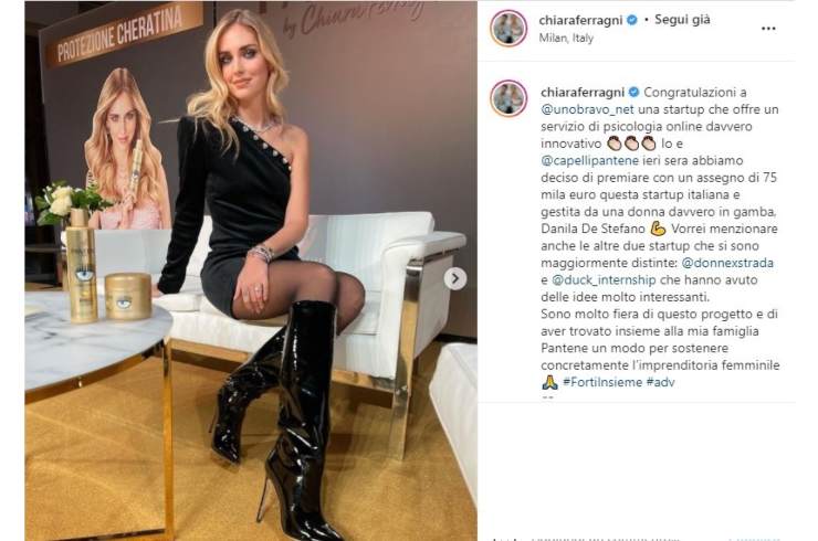 L’evento a cui la Ferragni ha preso parte, ha visto la premiazione di innovative e visionarie start up italiane lanciate proprio da donne. Dal supporto psicologico online post lockdown e per donne vittime di violenze, fino ad importanti seminari e corsi online per gli interessati, tante le iniziative premiate nel corso della serata.