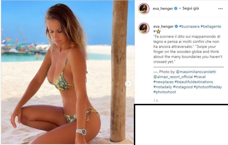L’ultimo scatto, come spesso sta accadendo, la ritrae in spiaggia. E’ quasi inginocchiata e sembra guardare la sabbia. E’ chiaramente in bikini e lascia tutti senza fiato; una fantasia floreale, molto colorata, con il reggiseno che sembra contenere a fatica il décolleté perfetto che ha. Ventre piatto, mini slip e lo sguardo fisso nella camera nella seconda delle due immagini postate.