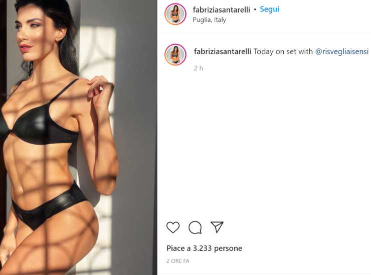 La Santarelli ha posato in uno splendido completo intimo nero che mette in risalto le sue curve. Nella prima immagine, la mora pugliese messa di profilo sfoggia il suo sorriso verso l’obbiettivo. Nella seconda invece, lo sguardo è intenso verso la camera e il corpo di Fabrizia viene messo in mostra in tutta la sua bellezza. I tanti follower hanno apprezzato il fascino mediterraneo della modella, e hanno invaso con apprezzamenti e commenti il post. Nella sezione commenti fioccano cuori e fiamme. “Sei bellissima” scrivono. In poche ore, il post ha raggiunto migliaia di like. Se queste sono le immagini del set, i fans non possono che aspettare con ansia nuovi contenuti del servizio fotografico.