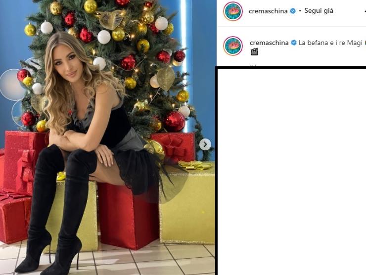 Il Natale è sempre più vicino, manca ormai circa una settimana e la Cremaschi si è di fatto portata avanti con il lavoro, come dimostrato nell’ultimo post pubblicato. L’Albero già bello e addobbato, un numero considerevole di doni. E la Cremaschi, più bella che mai, seduta su uno di questi con un abito incantevole, “da Befana” come ha svelato nella didascalia.