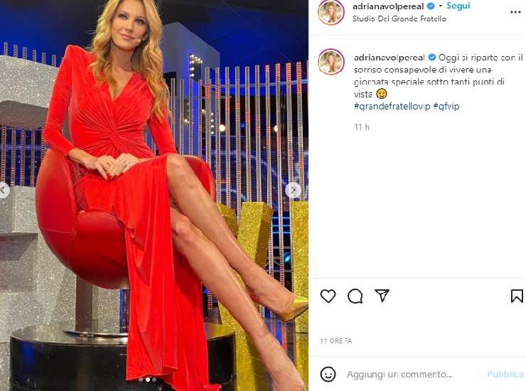 In un altro scatto Adriana Volpe è seduta nella sua poltrona da ‘opinionista’ e accavalla le gambe. Il sensuale e meraviglioso abito rosso scivola scoprendo gran parte delle sue favolose gambe. Inutile dire che i suoi seguaci sono impazziti, l’hanno infatti riempita di complimenti e like.