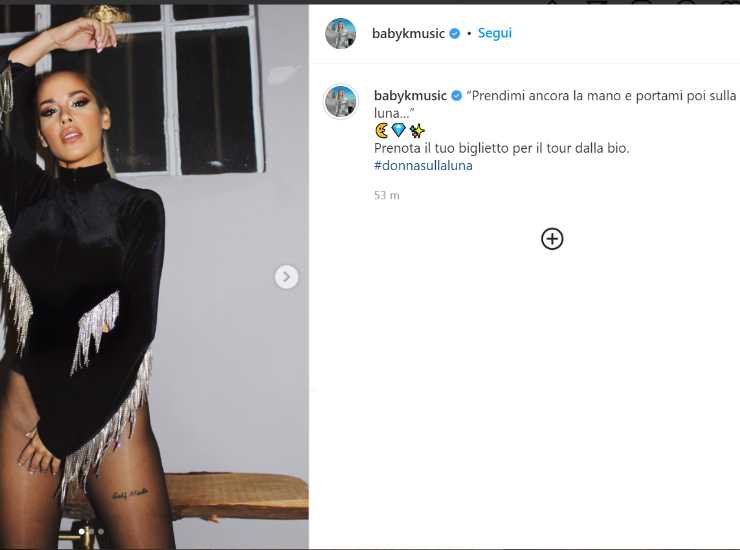 “Prendimi ancora la mano e portami poi sulla luna…” ha scritto la cantante riprendendo una frase del testo della sua canzone Luna, undicesimo brano dell’album Donna sulla Luna. La cantante ha già pronto il look di scena: un sensuale body nero con le frange. I fans sono già pronti: “Non vedo l’ora” “Oltre 600 chilometri solo per te” “Già presi…ci vediamo a Firenze!”. I biglietti per tutte le tappe del tour di Baby K sono come di consueto acquistabili nel circuito Ticketone.