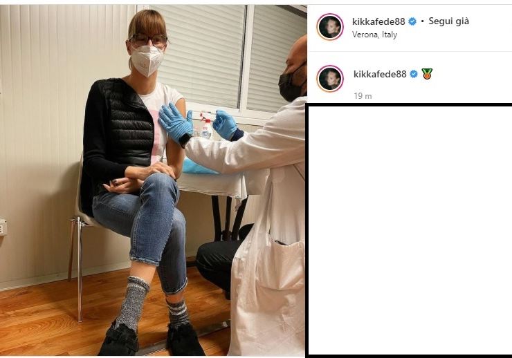 Si è infatti ritratta impegnata a ricevere la terza dose del vaccino, con l’infermiere pronto ad iniettare il siero nel braccio. Bella e rilassata, con la mascherina indossata, nella didascalia ha semplicemente commentato con una spunta blu ed una medaglia, quella del terzo posto, ad indicare proprio il numero delle inoculazioni ricevute.