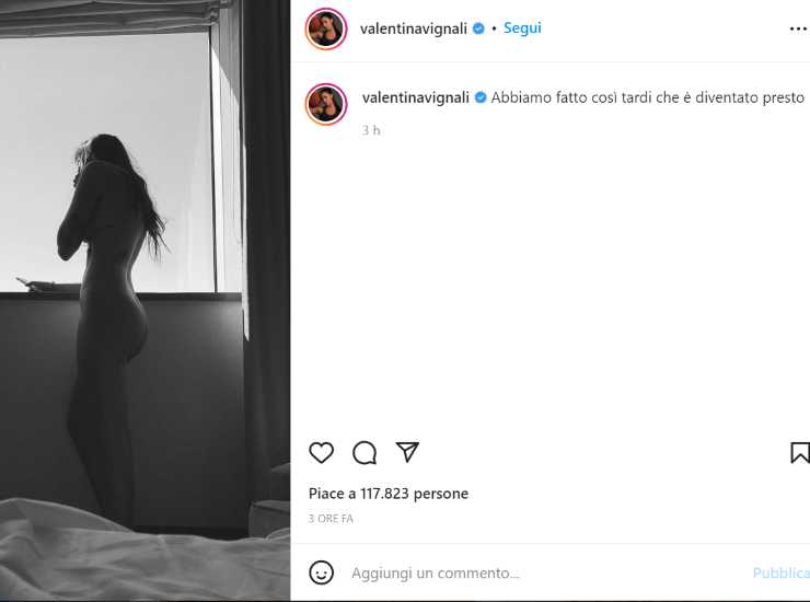 “Abbiamo fatto così tardi che è diventato presto” ha scritto la Vignali, che non è certo timida nel mostrare il suo fisico invidiabile. I suoi tantissimi follower (su Instagram è seguita da oltre due milioni di persone) non hanno certo perso tempo per ricoprire di mi piace e complimenti la modella. “Poi mi insegni ad essere così elegante su una foto in nudo” hanno scritto “Queste son le immagini che mi piacciono…sexy ma non volgare”. In tanti hanno apprezzato la componente artistica dell’immagine, elogiando il modo nel quale il fotografo è riuscito a raffigurare Valentina.