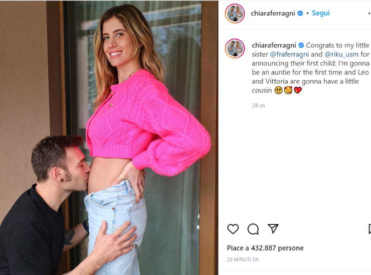 La neo zia Chiara è infatti stata la prima a congratularsi entusiasta con i neo genitori. “Tanti auguri alla mia sorellina Francesca e a Riccardo per l’annuncio del loro primo figlio” ha scritto in un post su Instagram “Sarò zia per la prima volta, e Leo e Vittoria avranno un cuginetto” aggiungendo una faccina emozionata e tanti cuori tutti destinati al nuovo piccolo arrivo di casa Ferragni.