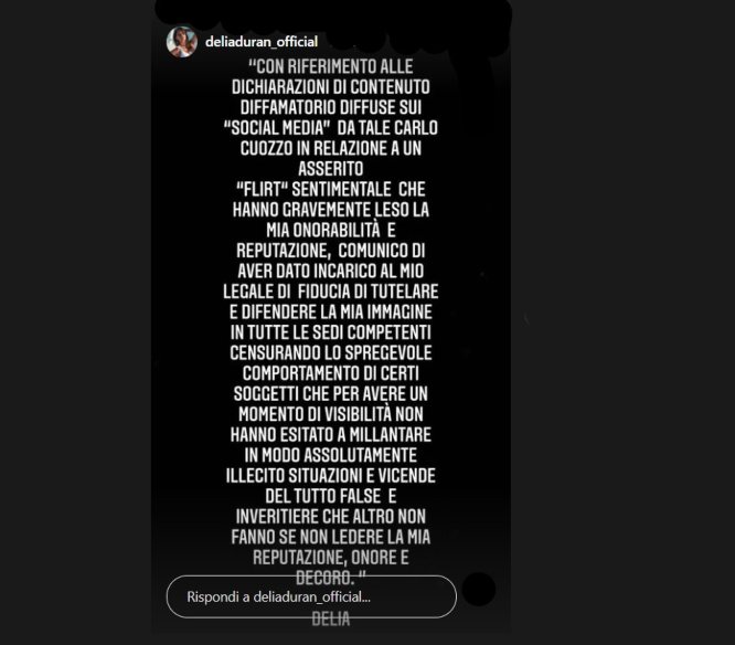 Poche ore fa, la donna ha pubblicato un contenuto su Instagram decisamente sorprendente. Si tratta di una storia Instagram nella quale scrive a lettere maiuscole: “Con riferimento alle dichiarazioni di contenuto diffamatorio diffuse sui social media da tale Carlo Cuozzo in relazione a un asserito flirt sentimentale che hanno gravemente leso la mia onorabilità e reputazione, comunico di aver incaricato il mio legale di fiducia di tutelare e difendere la mia immagine in tutte le sedi competenti, censurando lo spregevole comportamento di certi soggetti, che per avere un momento di visibilità non hanno esitato a millantare in modo assolutamente illecito situazioni e vicende del tutto false e inveritiere che altro non fanno se non ledere la mia reputazione, onore e decoro. Delia”.