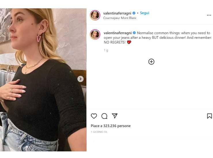 “Normalizziamo le cose comuni: quando devi aprirti il bottone dei jeans dopo una cena pesante ma deliziosa. E ricordate: nessun rimpianto” ha scritto l’influencer, mostrando l’immagine del pantalone slacciato, in perfetto stile post pasto. E come darle torto? Non c’è niente di meglio di un momento di libertà dopo una bella scorpacciata. I social vengono spesso accusati di fare emergere un immagine distorta e irrealistica del mondo. Valentina Ferragni ha invece scelto di andare contro corrente e mostrare la normalità di un gesto comune a molti. A testimonianza di questo i tanti messaggi lasciati dai follower, che si sono ritrovati nel messaggio dell’imprenditrice. “Anche io lo faccio sempre” “Una di noi” “Per fortuna della sana normalità” le hanno scritto divertiti.