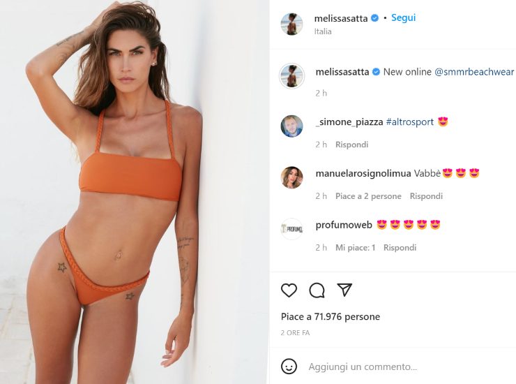 Nel post Melissa ha sfoggiato un due pezzi sportivo arancione che ha messo in risalto il suo fisico perfetto. “Atomica” “Spettacolare” hanno commentato i fans che si sono precipitati a commentare lo scatto postato. “Favolosa!” “Datele l’Oscar!”. D’altronde, prima ancora di farsi conoscere dal grande pubblico con Striscia la Notizia, la showgirl ha iniziato la sua carriera proprio come modella, e non si è mai allontanata dal mondo della moda. Per cui non ha certo perso il feeling con l’obbiettivo. Non è un caso che continui ad essere uno dei volti più richiesti dai brand del nostro paese.