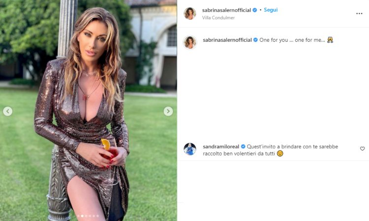 Una profonda scollatura permette infatti di ammirare l’abbondante decolleté della Salerno, mentre lo spacco altissimo della gonna ci permette di ammirarne le gambe perfette. Sabrina nelle foto è baciata dal sole durante quello che sembrerebbe un aperitivo al tramonto, mentre nelle mani tiene un cocktail. “One for you…one for me“, scrive nella didascalia del post citando la celebre canzone. Per lei, come sempre sono tantissimi i like e commenti.