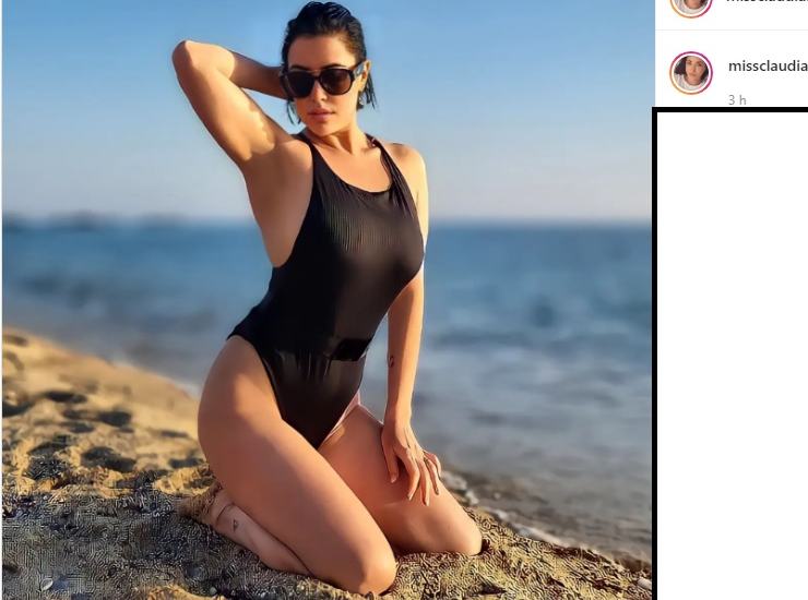 Oggi, invece, ha deciso di cambiare nuovamente; niente bikini, ma un costume intero. Un unico pezzo nero che mette in evidenza le sue forme, con la parte inferiore sempre decisamente sgambata. Posa sensuale, a mò di sirena, inginocchiata sulla sabbia con la mano destra nei capelli bagnati. L’outfit è completato da un paio di grandi occhiali da sole.